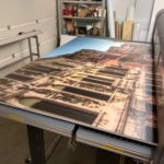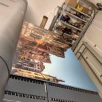 Egy 5 méter széles szekrényt tervezett a hálószobába, amelynek a frontján egy Velencei tájkép ékeskedik. Fehér bútorlapokat kaptunk, amiket az UV tábla nyomtatónkkal megnyomtunk. A nehézség az volt, hogy az 5 db 1 méteres panelt úgy kellett megnyomtatni, hogy a kép tökéletesen illeszkedjen. Ilyenkor mindig kifutós grafikát kérünk, és utólag vágjuk meg az alapanyagot. Jelen esetben ez nem lehetett opció, mert az élvédő milliméteres oldalát is meg kellett nyomtatnunk. Végül pontosan 3.00 mm-es távtartókkal pozicionáltuk a táblákat és kettesével nyomtattuk meg azokat. Tökéletes lett az eredmény. Szép színekkel, tűéles nyomattal és jó pozícióval.