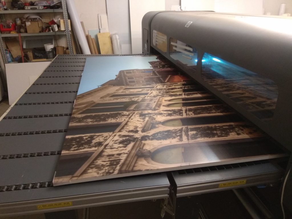 Egy 5 méter széles szekrényt tervezett a hálószobába, amelynek a frontján egy Velencei tájkép ékeskedik. Fehér bútorlapokat kaptunk, amiket az UV tábla nyomtatónkkal megnyomtunk. A nehézség az volt, hogy az 5 db 1 méteres panelt úgy kellett megnyomtatni, hogy a kép tökéletesen illeszkedjen. Ilyenkor mindig kifutós grafikát kérünk, és utólag vágjuk meg az alapanyagot. Jelen esetben ez nem lehetett opció, mert az élvédő milliméteres oldalát is meg kellett nyomtatnunk. Végül pontosan 3.00 mm-es távtartókkal pozicionáltuk a táblákat és kettesével nyomtattuk meg azokat. Tökéletes lett az eredmény. Szép színekkel, tűéles nyomattal és jó pozícióval.