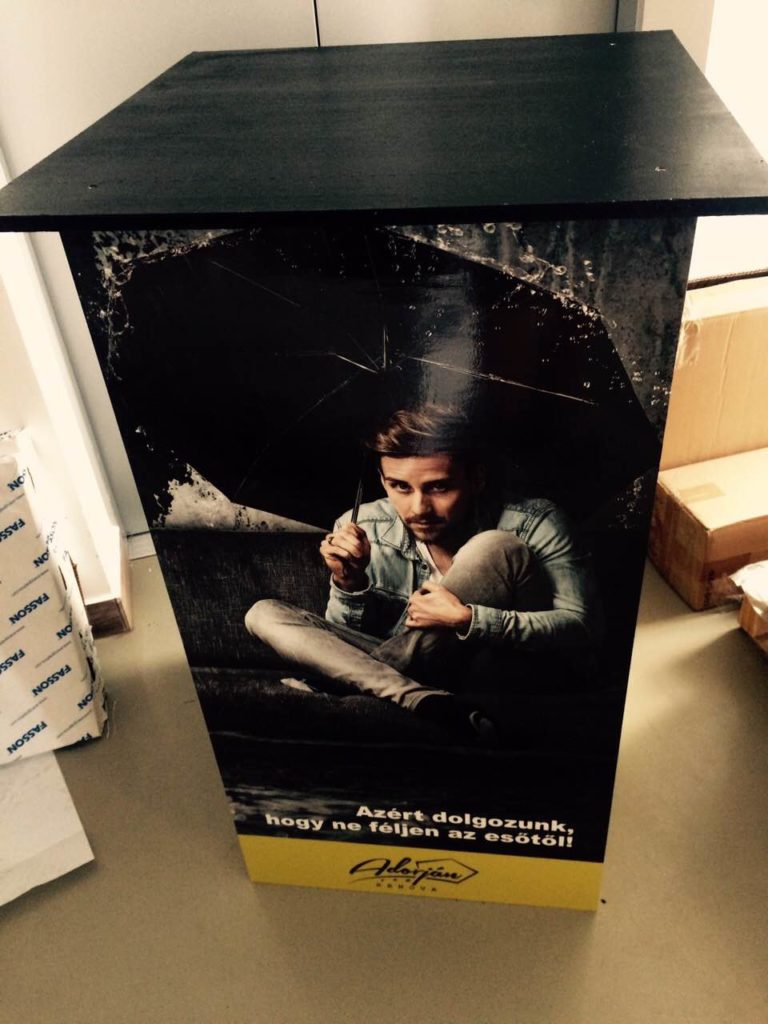 Az ügyfelünknek egyedileg gyártottunk fából egy pultot, amit grafikával láttunk el. Jelen esetben nem nyomtattuk közvetlen a rétegelt lemezt, hanem nyomott, laminált fóliával húztuk be a kész pultot. A kínáló pult remek kiállítási eszköz. Jól néz ki és hasznos is, mivel elnyeli az összes prospektust, laptopot… bármit.